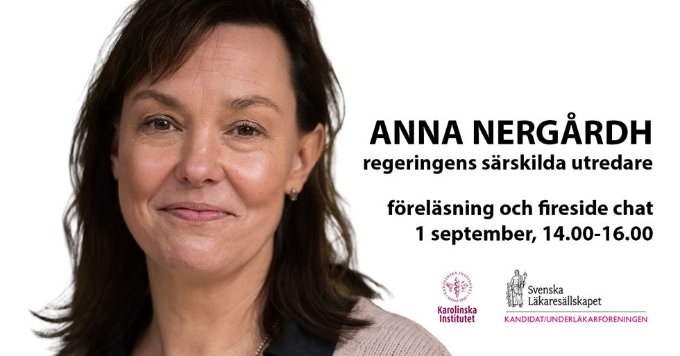 Svenska Läkaresällskapets Kandidat- och Underläkarförening (SLS KUF) anordnade en föreläsning och fireside chat med Anna Nergårdh, särskild utredare för utredningen "Samordnad utveckling för God och Nära Vård" tillsammans med Karolinska Institutet.
