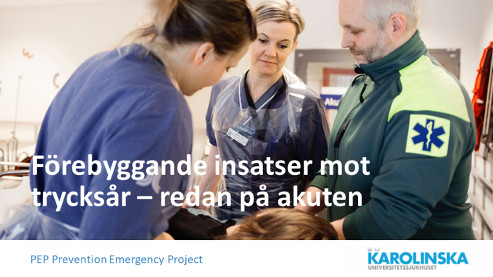 Det gäller Prevention Emergency Project (PEP) och implementering av trycksårsprevention på Akuten Huddinge, som ett samarbete mellan Karolinska, ambulansbolagen i Stockholm och Mölnlycke AB. Länk till PEP som Poster