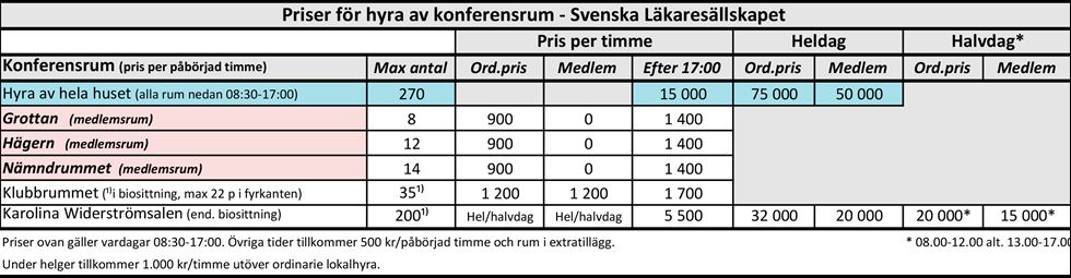 Samtliga mötesrum är utrustade med block, pennor, frukt, vatten, whiteboard, webbkamera, högtalare, TV-skärm och trådlöst nätverk. Kvällstillägg tilkommer för alla bokningar innan och efter kansliets ordinarie öppettider 500 kr/tim. Helgtillägg tillkommer för alla bokningar 1 000 kr/tim.