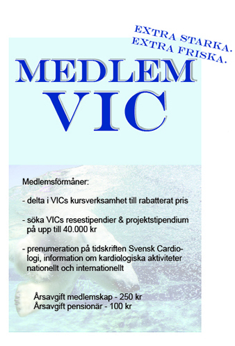 Som VIC-medlem betalar du endast 250 kr/år och då får Du delta i föreningens kursverksamhet och söka stipendier. Varje år utdelas resestipendier och projektstipendier. Du får dessutom tidskriften SVENSK KARDIOLOGI, som utkommer kvartalsvis med information om kardiologiska aktiviteter nationellt och internationellt.